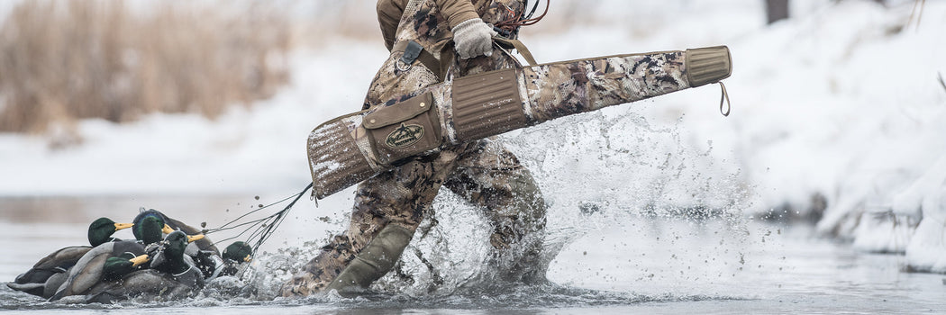 Lightweight and packable. Streamlined enough to fold up and stuff in your blind bag. Water-repellant outer shell, adjustable shoulder strap and double-layer tip to prevent the barrel from busting through the end.